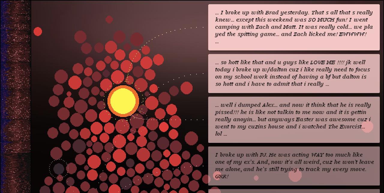 But what if this limitation is simply a result of the representational techniques that artists had at their disposal? Consider, for instance, how the techniques of films invented in the first two decades of the twentieth century – editing and different types of shots – have allowed film directors to alternate between close-ups showing individuals and long shots showing the groups to which these individuals belong. Given this example, what can we expect from computers? Can computer media be used to create artistic representations that link the individual and the social without subsuming one in the other, i.e. the particular in the general? If we consider the range of computer techniques available for organising and viewing data, things look quite encouraging. We can switch between multiple views of the same data, traverse the data at different scales, and move between multiple media linked together. And we can do this in near or close to real time. We can also instruct software to search through and mine very large amounts of data – such as the data produced by the millions of real people who engage in online chat, write blogs, send emails, upload their photos on Flickr and so on. What types of representation can be created if we combine these computer techniques and new ways of gathering data as well as of structuring and displaying it?