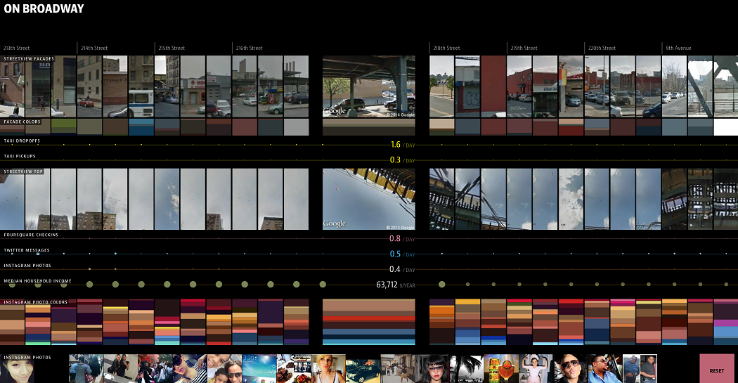 User-generated visual media such as images and video shared on Instagram, YouTube, Sino Weibo, VK, Flickr and other popular social media services open up amazing opportunities for the study of contemporary visual culture and urban environments. By analyzing media shared by millions of users today, we can understand what people around the world imagine and create; how people represent themselves and others; what topics, styles and visual techniques are most popular and most unique, and how these topics and techniques differ between locations, genders, ages, and many other demographic characteristics. In a number of projects completed between 2012 and 2015, we analysed large number of images shared on Instagram by people in urban areas. This article discusses two of these projects: Selfiecity (2014) and On Broadway (2015). In Selfiecity, we compared patterns in self-representations using a collection of “selfie” photos shared on Instagram by people in five global cities. In On Broadway, we focused on a single street in NYC – part of Broadway running through Manhattan for 13 miles – and analysed images shared along Broadway on Instagram and Twitter, Foursquare check-ins, taxi rides, and selected economic and social indicators using U.S. Census data. The article presents our methods, findings, and unique interactive interfaces for explorations of the collected data we constructed for each project.